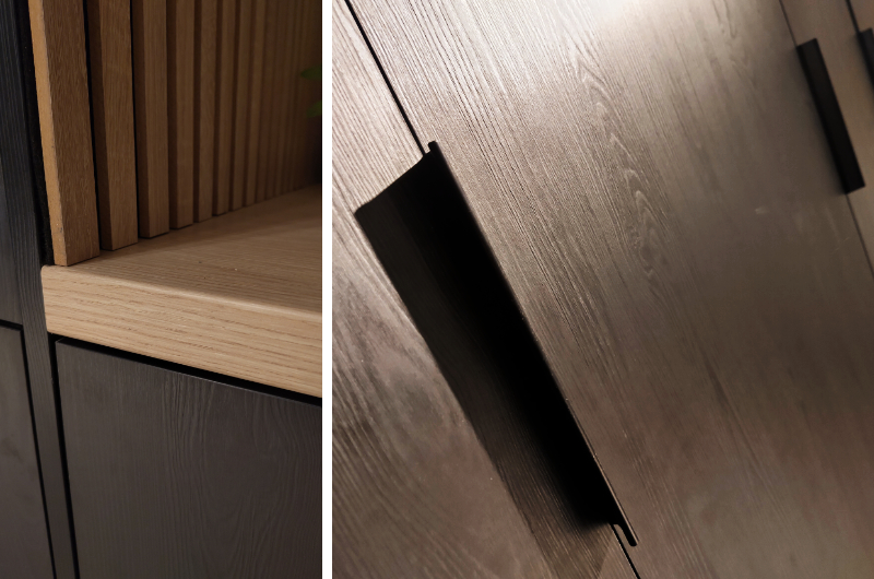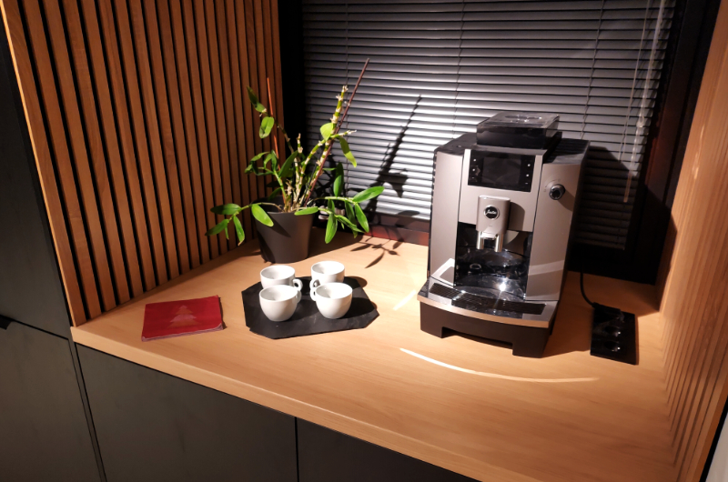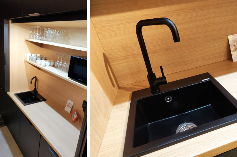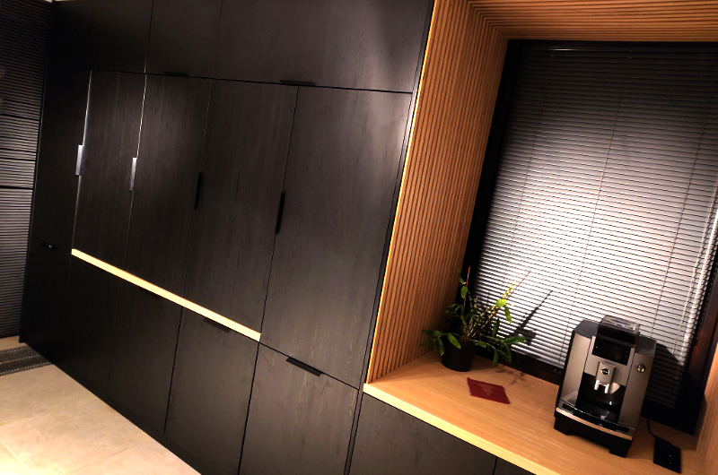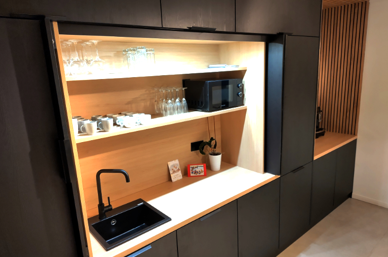 Création, conception et agencement complet de cette cuisine sur-mesure installée dans une salle de réunion. Des pockets door (portes escamotables et pivotantes) ont été choisies pour dissimuler de façon élégante et pratique la partie « évier », la solution idéale pour optimiser cette cuisine.
